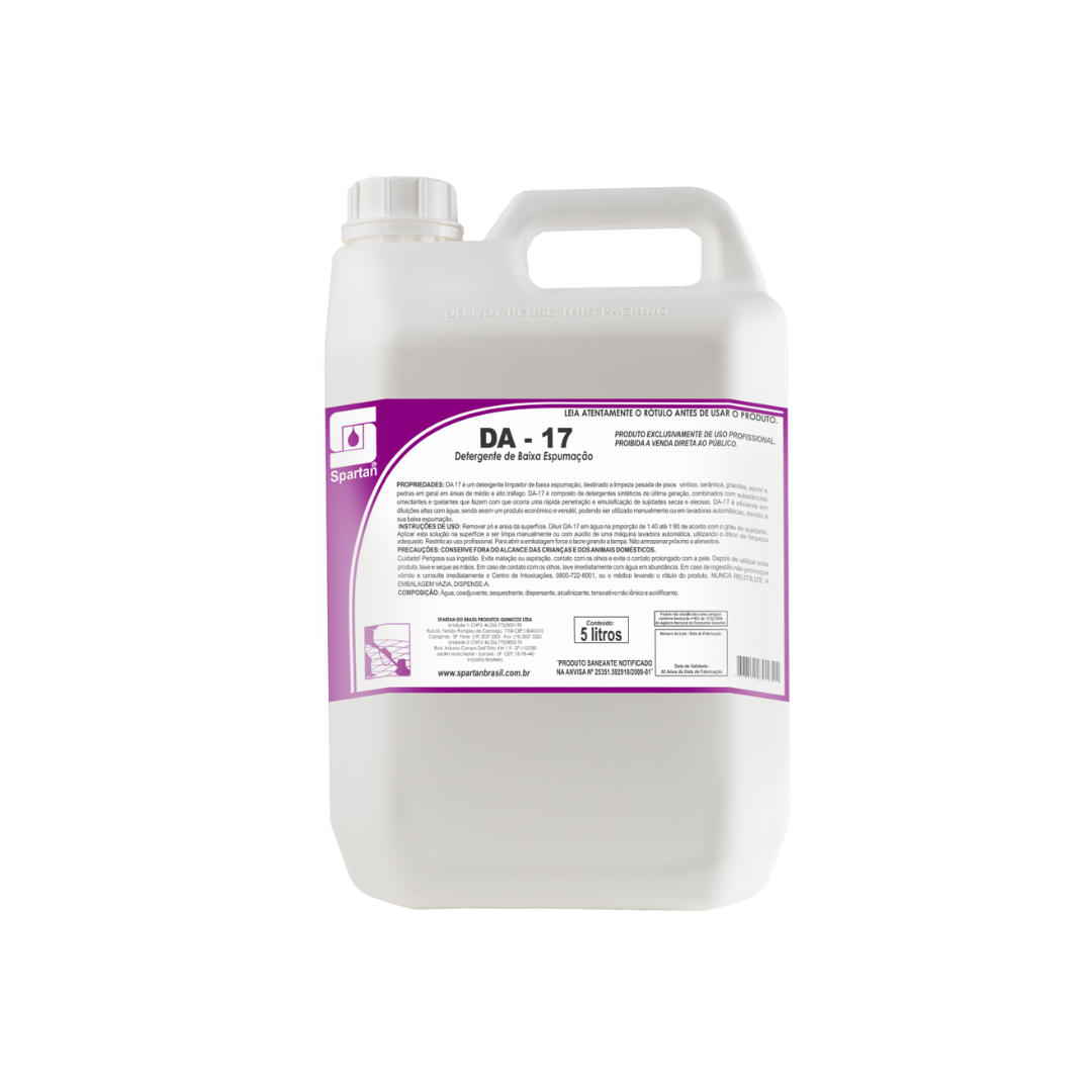 Detergente concentrado DA-17 possui baixa formação de espuma, sendo ideal para limpeza pesada de pisos vinílicos, cerâmicos, porcelanatos, granilite, epóxi e pedras em geral. Recomendado para uso em lavadoras automáticas, oferece alta eficiência em áreas de médio e alto tráfego, mantendo os pisos limpos e conservados.