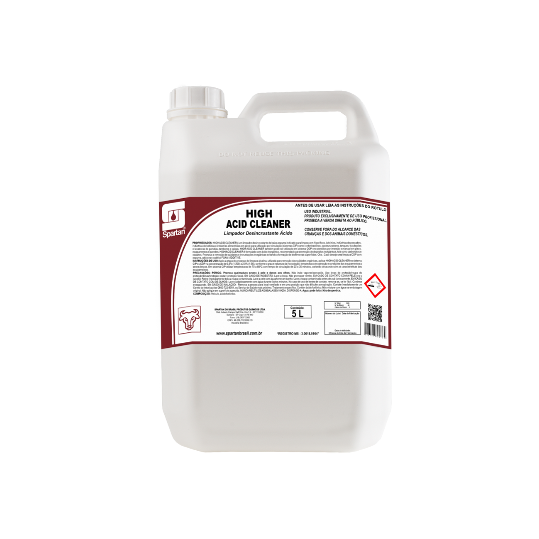 High Acid Cleaner é um limpador desincrustante de baixa formação de espuma, especialmente indicado para limpeza em frigoríficos, laticínios, indústrias de pescados, bebidas e alimentícias em geral. Desenvolvido para uso em sistemas de circulação (CIP), é ideal para higienização de ordenhadeiras, pasteurizadores, tanques, tubulações, lavadoras de garrafas, tambores e caixas, garantindo limpeza eficaz e proteção dos equipamentos.
