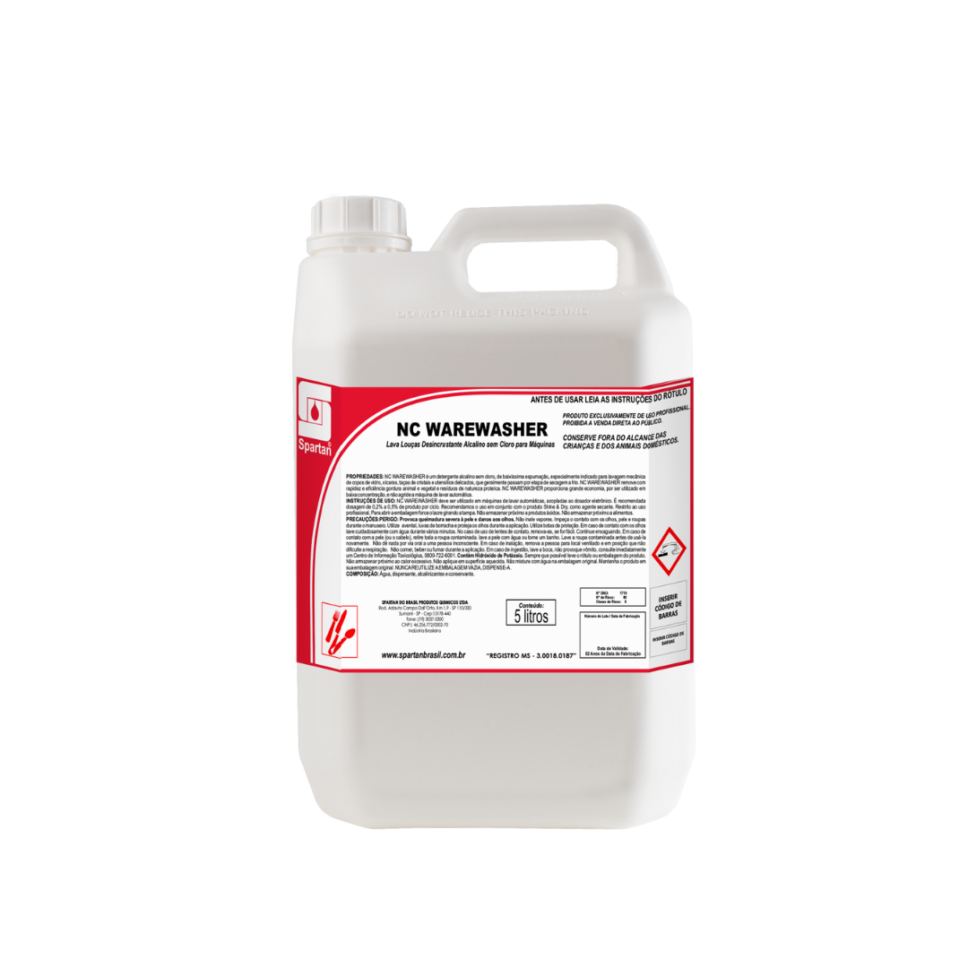 O NC Warewasher é um detergente lava-louças alcalino, formulado sem cloro e com baixíssima espumação, ideal para a lavagem mecânica de pratos, talheres, copos de vidro, taças de cristal, utensílios delicados, xícaras, pires, cerâmica, porcelana, vidro, metal, bandejas e caixas.