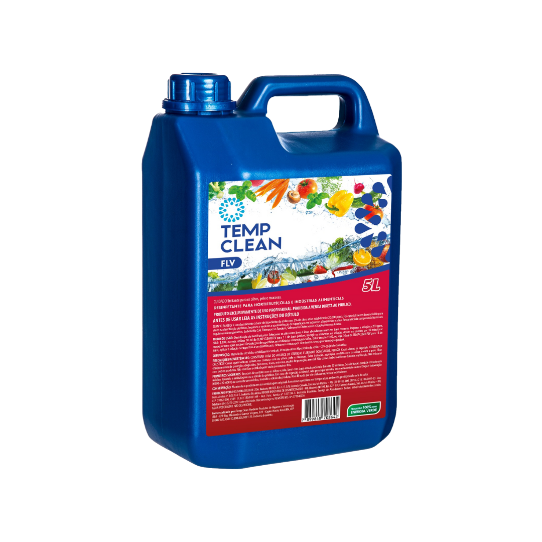 Temp FLV é um desinfetante à base de hipoclorito de sódio com 2% de cloro ativo estabilizado (20.000 ppm), desenvolvido especialmente para a desinfecção de frutas, legumes, verduras e superfícies em indústrias alimentícias e setores relacionados. Sua eficácia é comprovada contra micro-organismos como Escherichia coli, Enterococcus faecium, Salmonella choleraesuis e Staphylococcus aureus, garantindo segurança e higiene em processos alimentares.